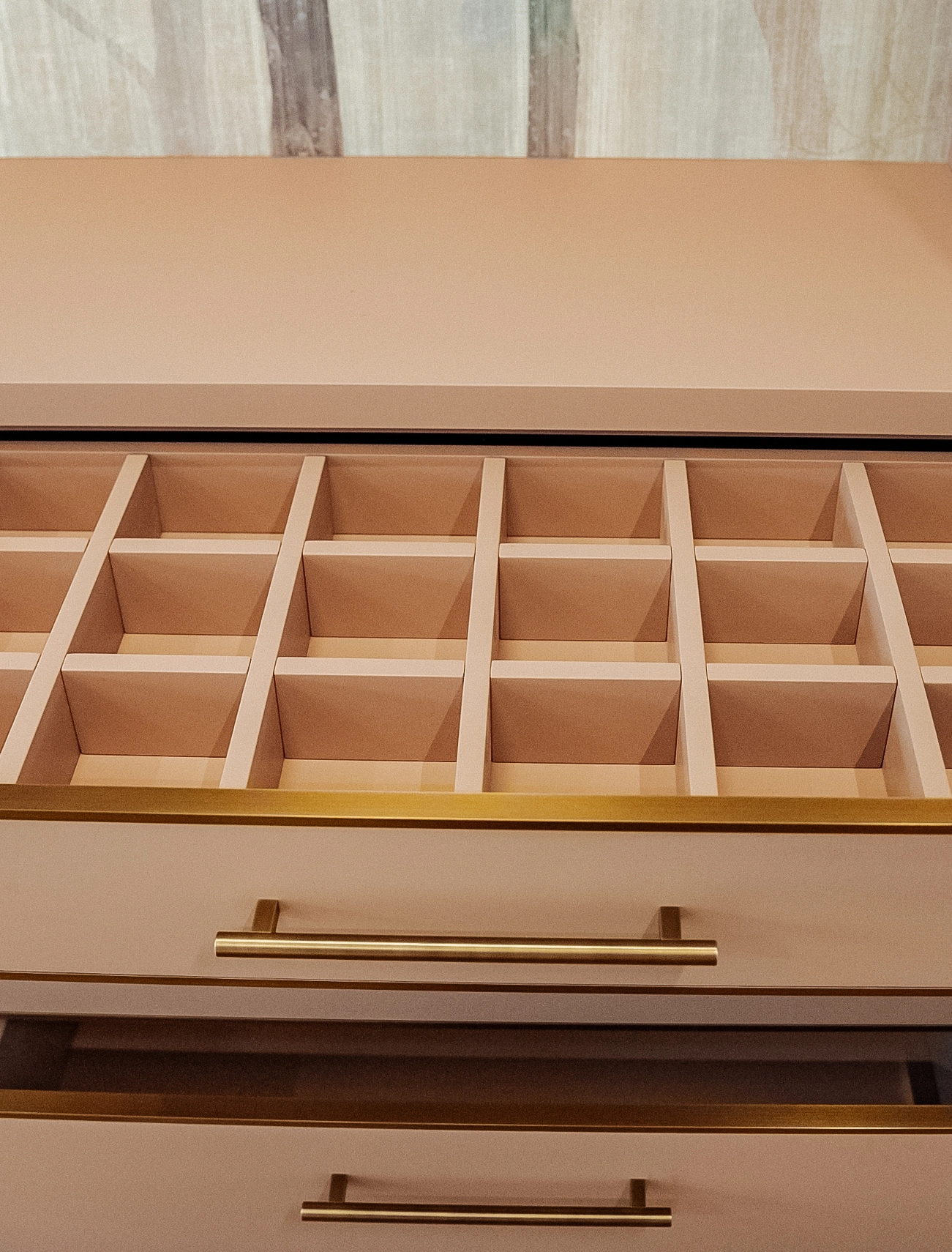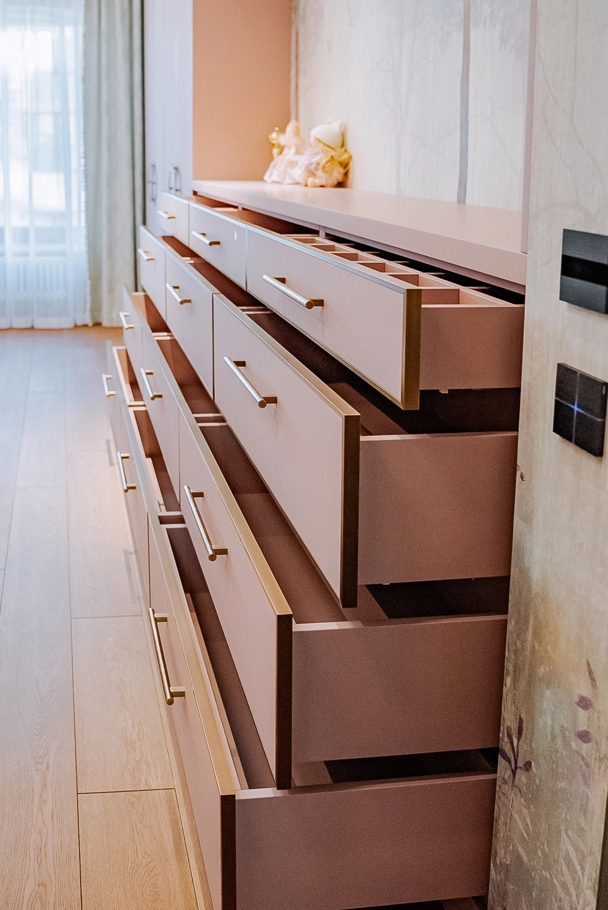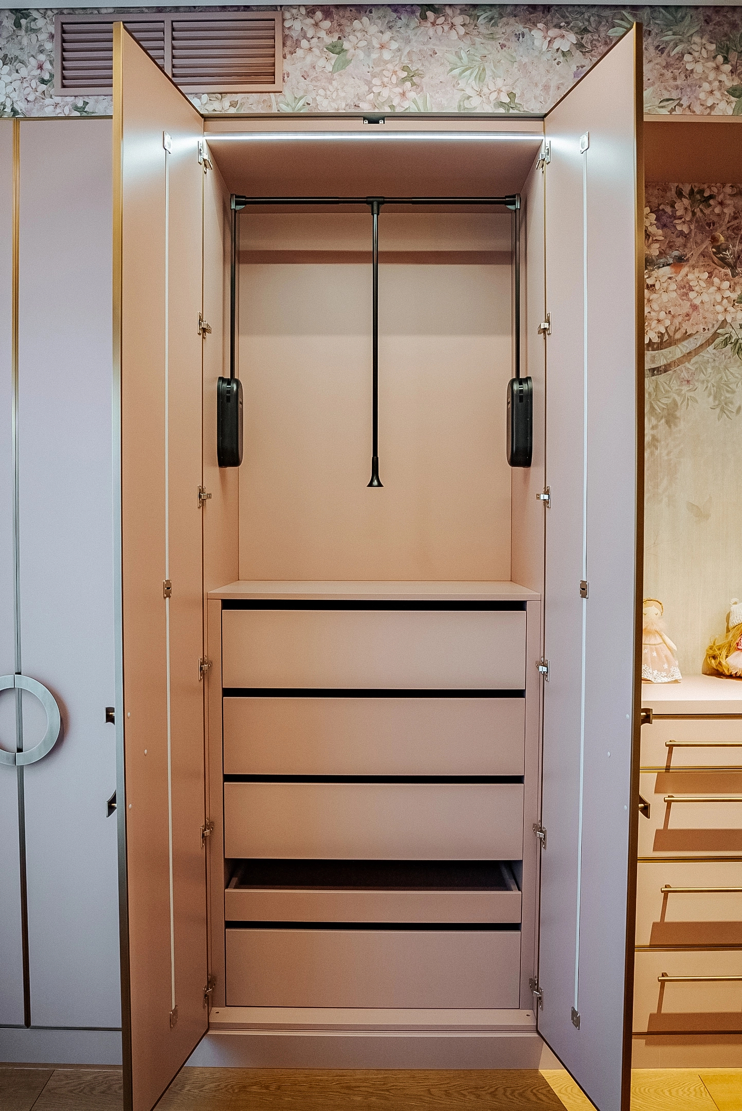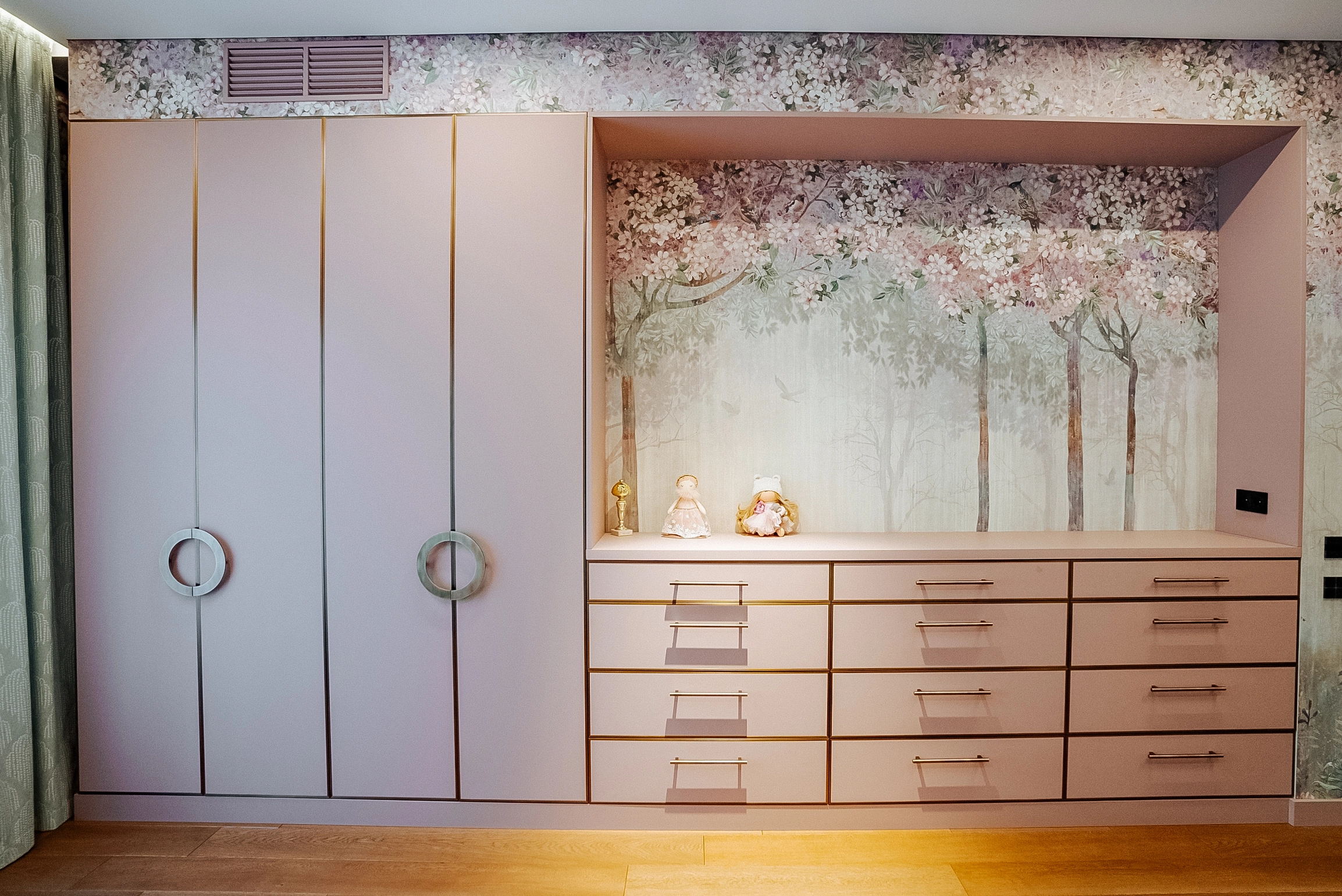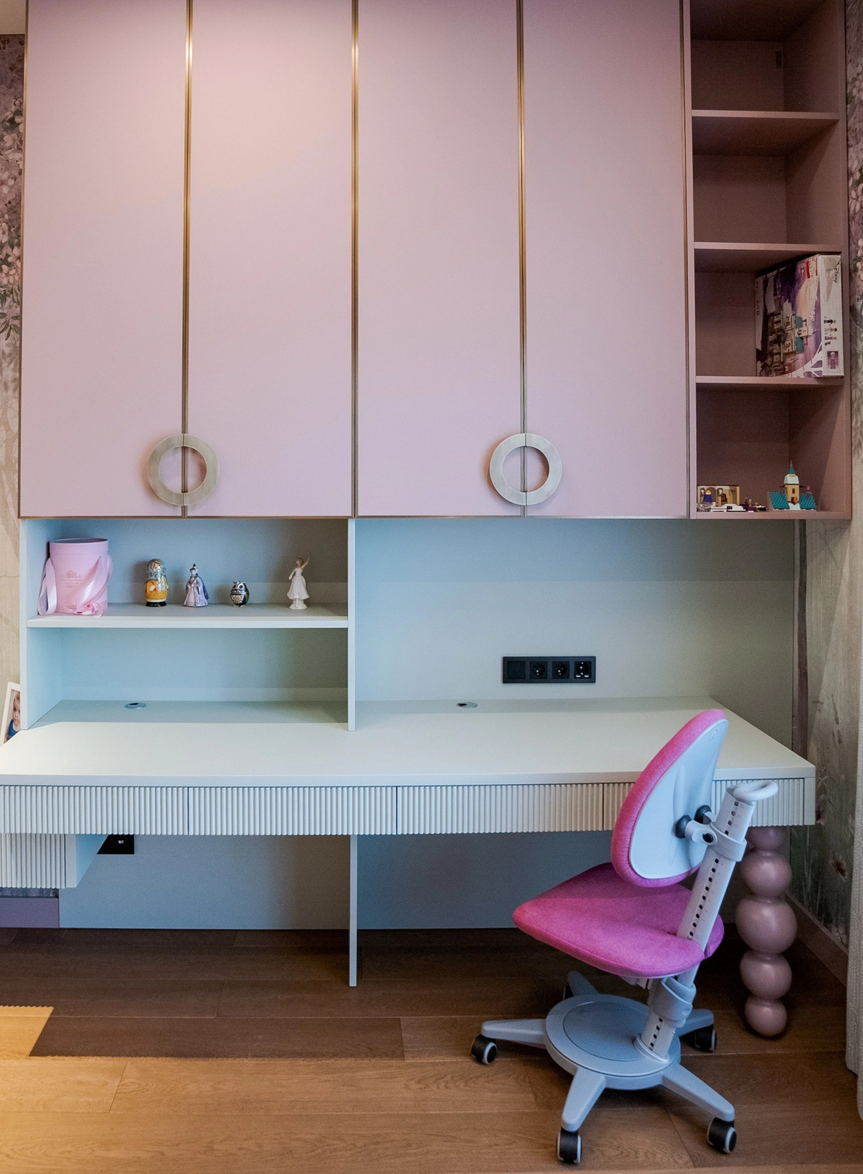 Центральное место — вместительный шкаф с фасадами в золотой алюминиевой рамке с броскими круглыми и прямыми ручками. Продуманная внутренняя организация: просторные полки для сложенной одежды, штанги для платьев, множество небольших ящиков с делениями для аксессуаров и мелочей. Туалетный столик — уголок красоты и самовыражения. Достаточно места для косметических принадлежностей и личных сокровищ. Письменный стол — эргономичная столешница, навесной шкафчик для учебников и папок, открытые полки — для любимых книг и декора.