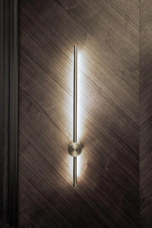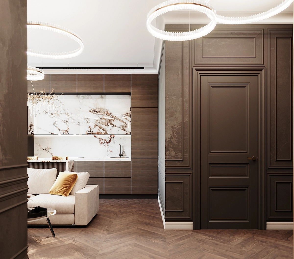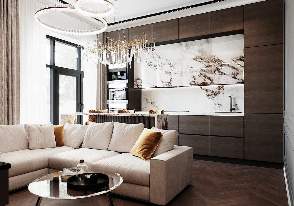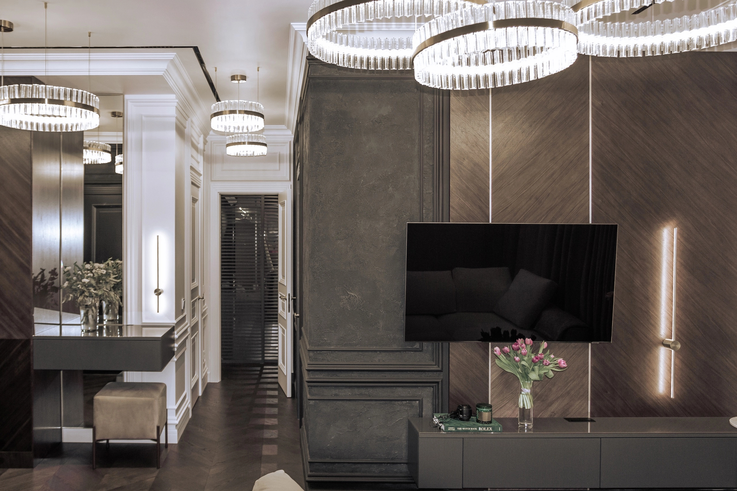 Гостиная, объединенная с прихожей, отделана панелями с натуральным шпоном дуба. Это воплощение природной элегантности и тёплого уюта. Шпон дуба придаёт интерьеру благородный, слегка винтажный шарм, не перегружая его тяжеловесностью массивной древесины. Благодаря тонкости материала (обычно 0,5-3 мм) стены выглядят изящно, сохраняя при этом тактильную привлекательность натурального дерева. Шпоном отделаны и фасады шкафа в прихожей. В тон стенам подобран материал для мебели. Все вместе смотрится гармонично и целостно.