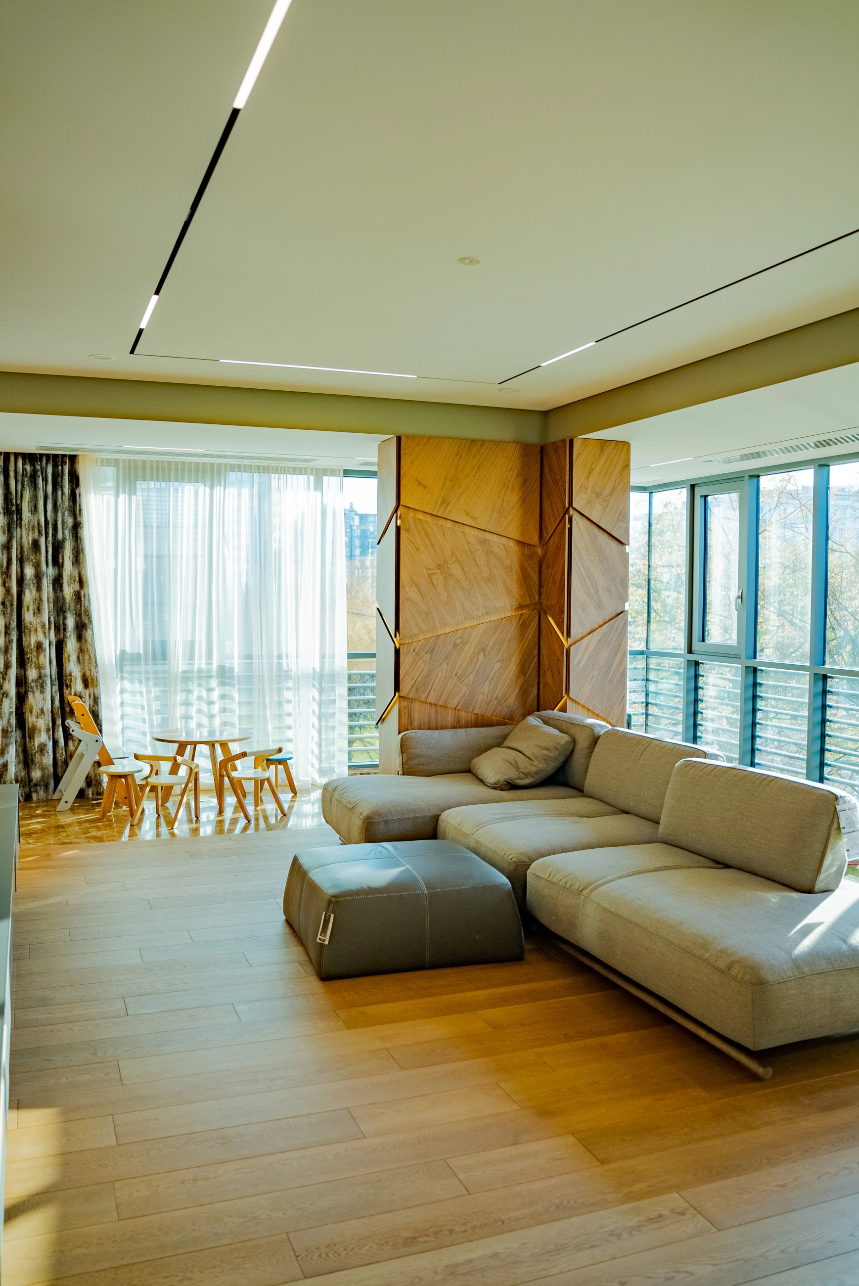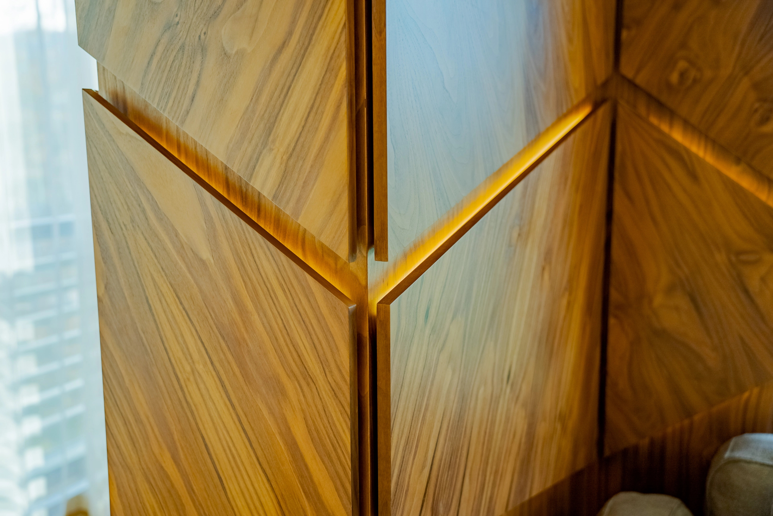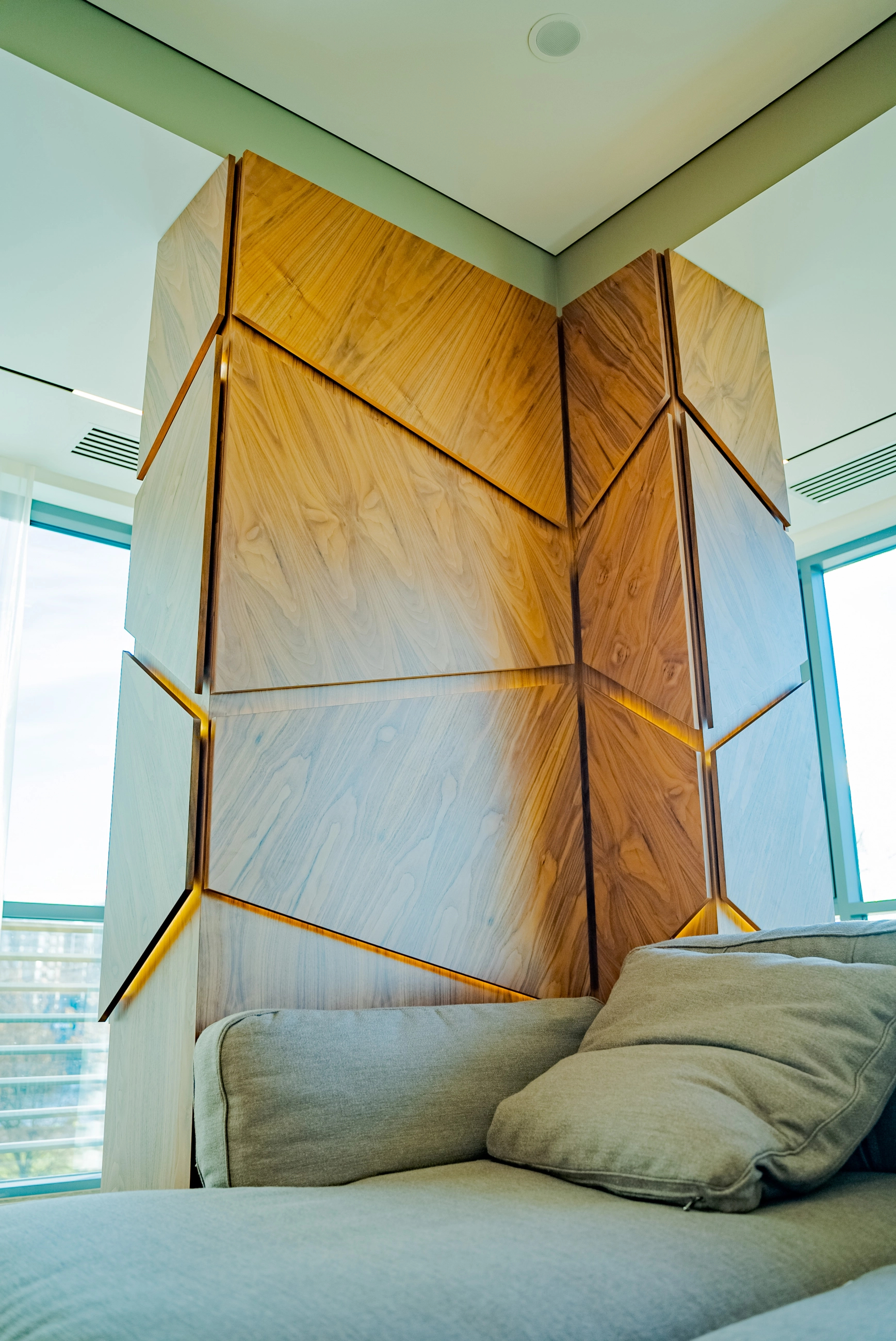 Проект по созданию стеновых панелей из шпона ореха и панелей с подсветкой для колонн стал настоящим украшением интерьера. Размещение материала ломанными линиями и наличие подсветки визуально облегчает эту довольно массивные колонны, эстетично вписывая ее в пространство. Мы смогли объединить функциональность, эстетическую привлекательность и современные технологии, что позволило создать уникальное пространство, где комфорт и стиль идут рука об руку.