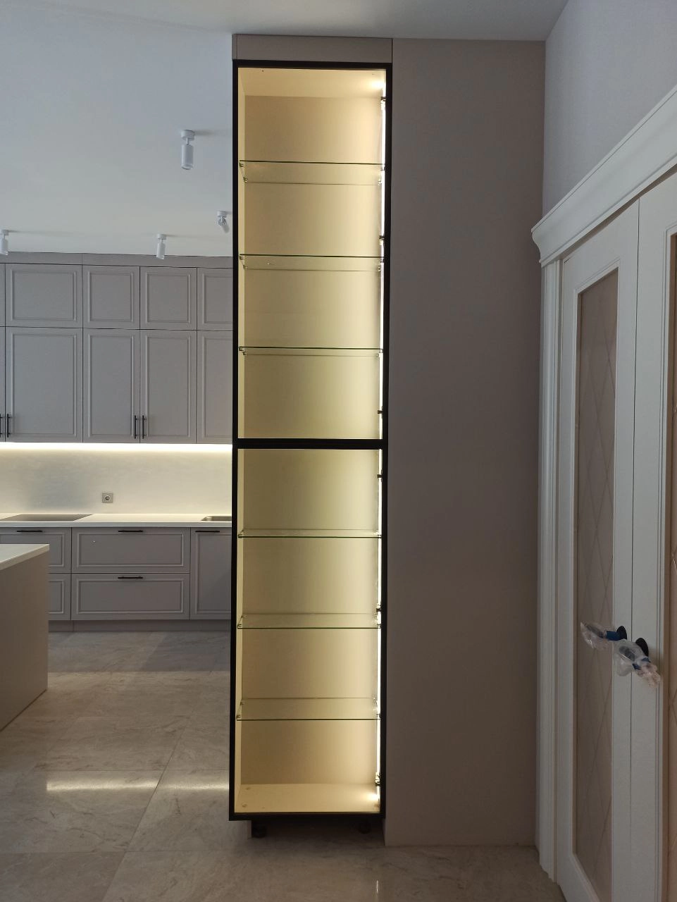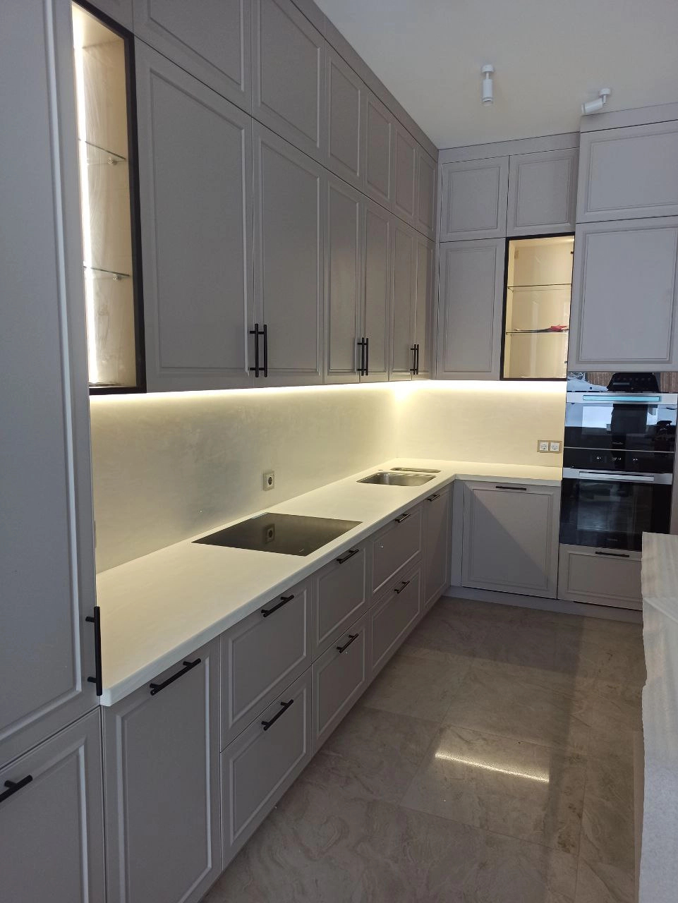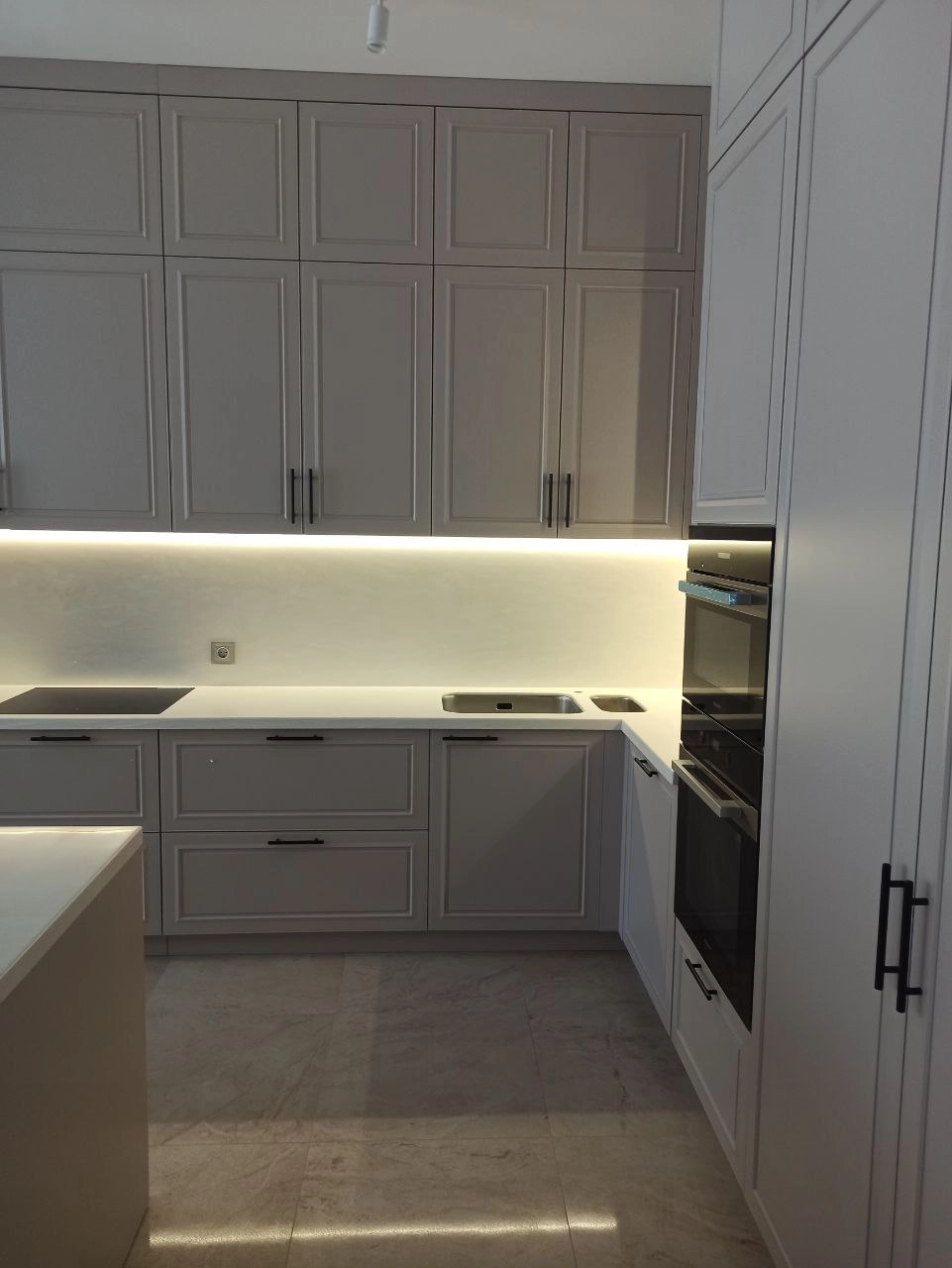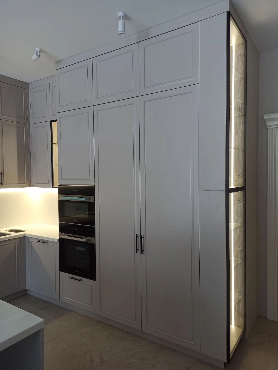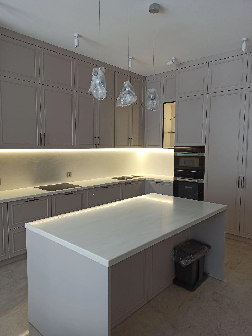 Фасады выполнены из МДФ и окрашены эмалью. Классический вариант фрезеровки а акцентные черные ручки дополняют внешний вид кухни, а стеклянные фасады в алюминиевой рамке прибавляют легкости и открытости пространства. Столешницы выполнены по индивидуальному заказу из искуственного мрамора