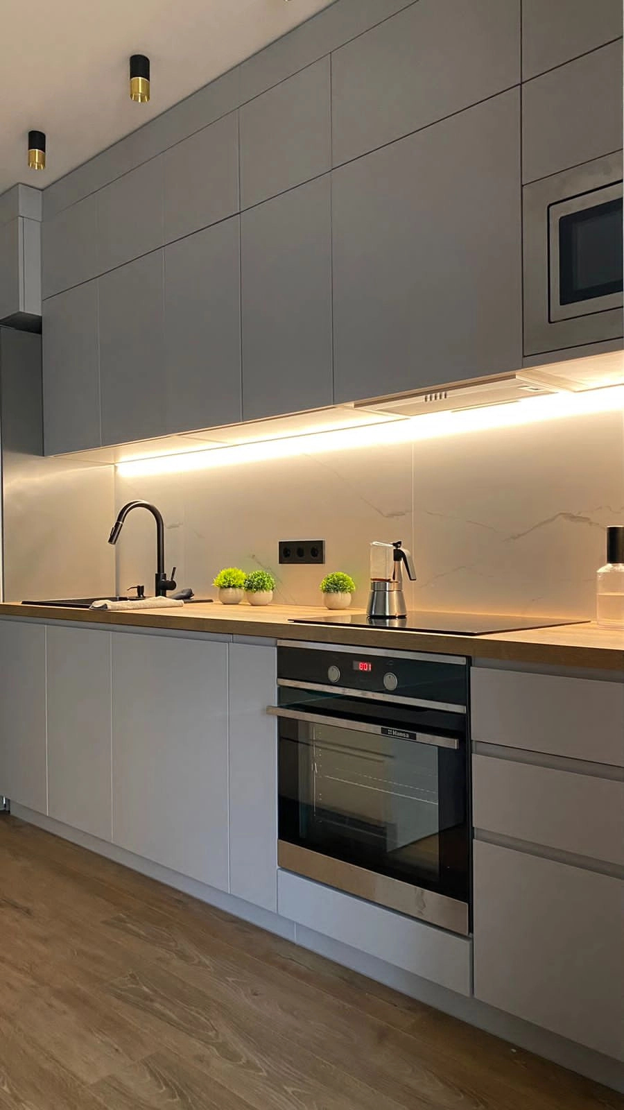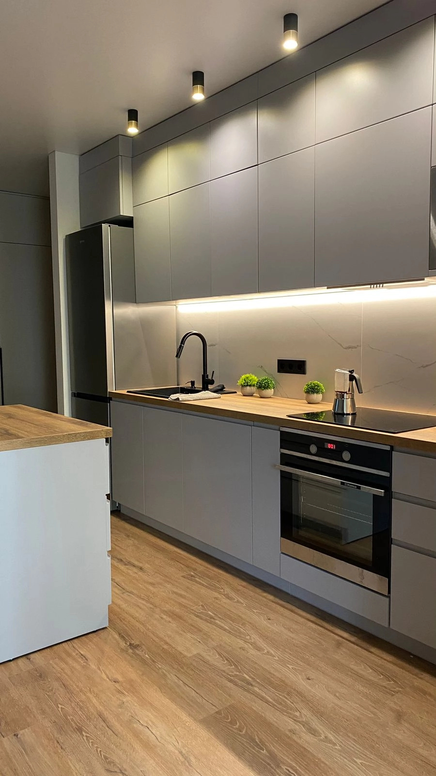 Светло-серая кухня отвечает всем требованиям сегодняшнего дня – минималистичный дизайн, трендовые цвета фасадов и столешницы, отдельно-стоящий остров с рабочей поверхностью. Отсутствие классических ручек – современная тенденция, которая все чаще находит своих поклонников. Столешница из утолщенного МДФ – надежная и долговечная.