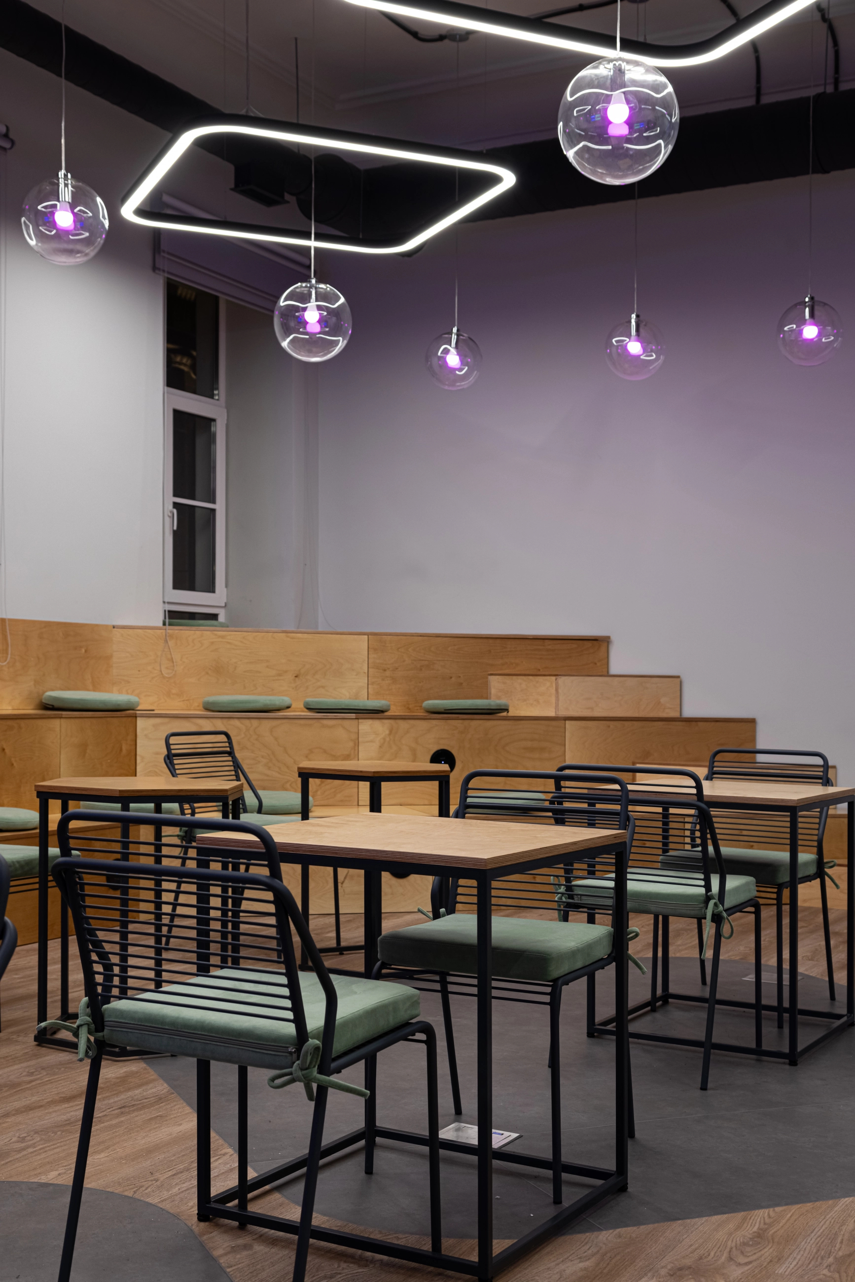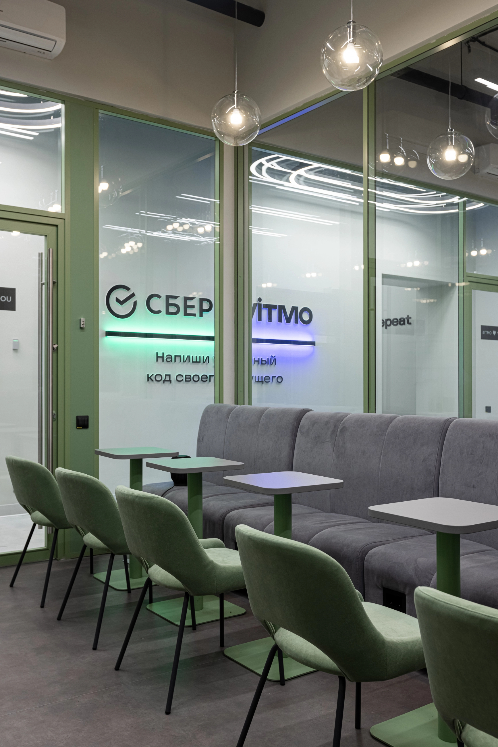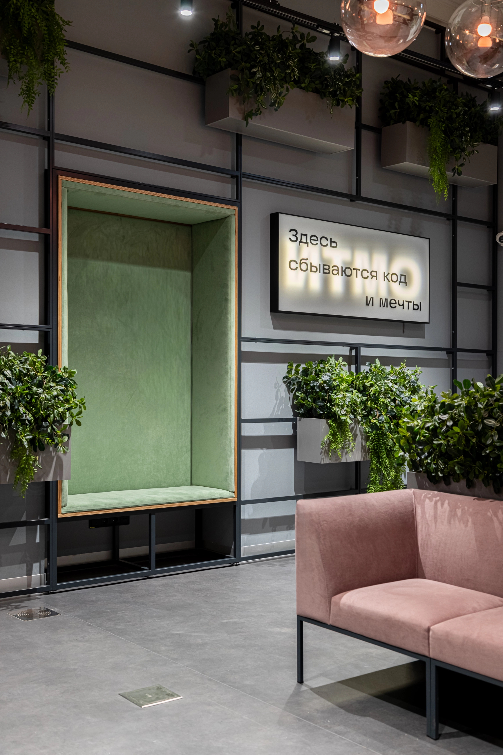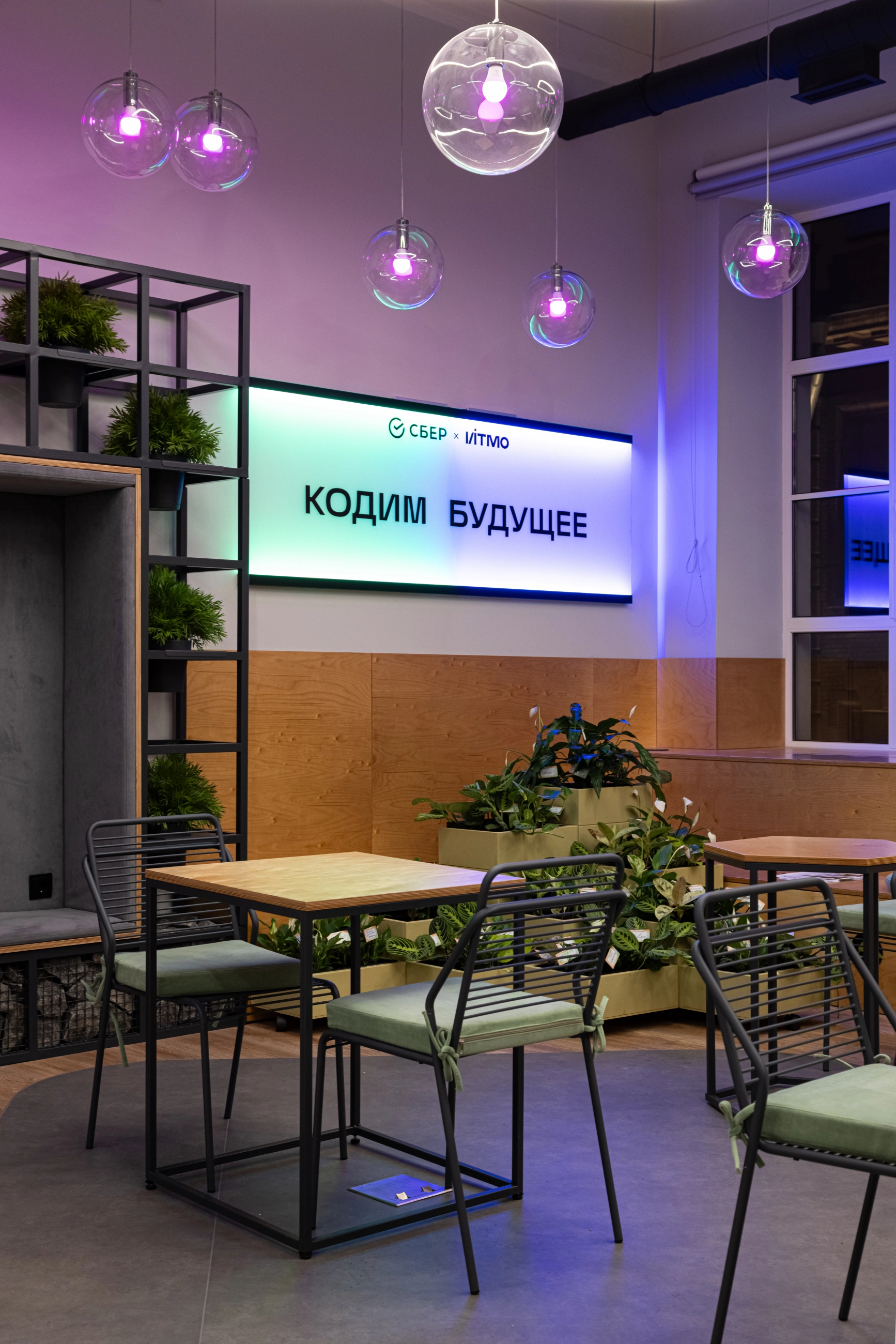 По заказу ИТМО и Сбербанка - создали пространство оборудованное всем необходимым для комфортной работы и учёбы: есть зоны для индивидуальной работы, переговорные для командных проектов и места для отдыха. Мебель изготовлена из фанеры и металлических каркасов.