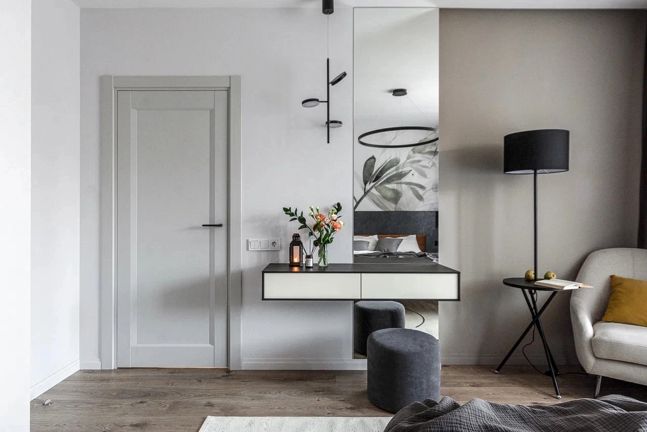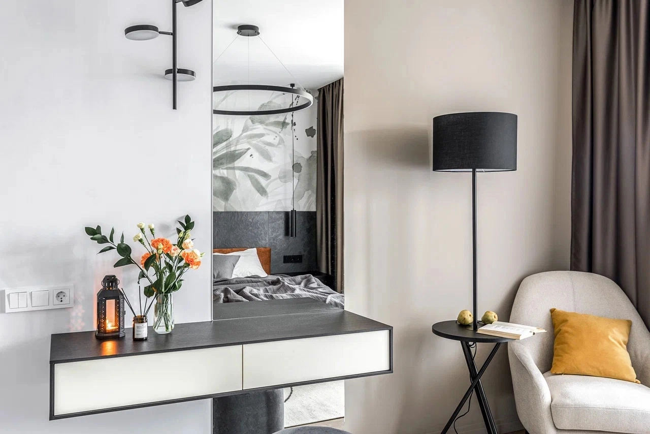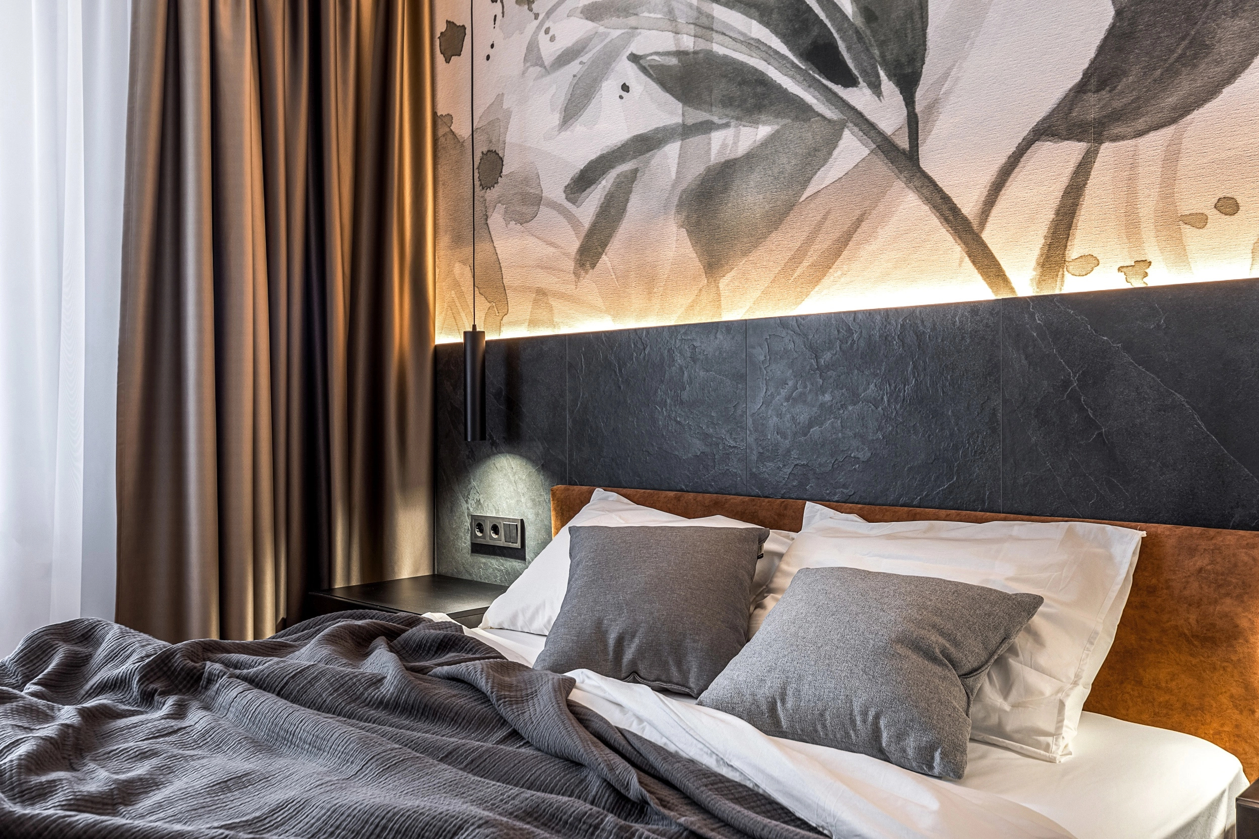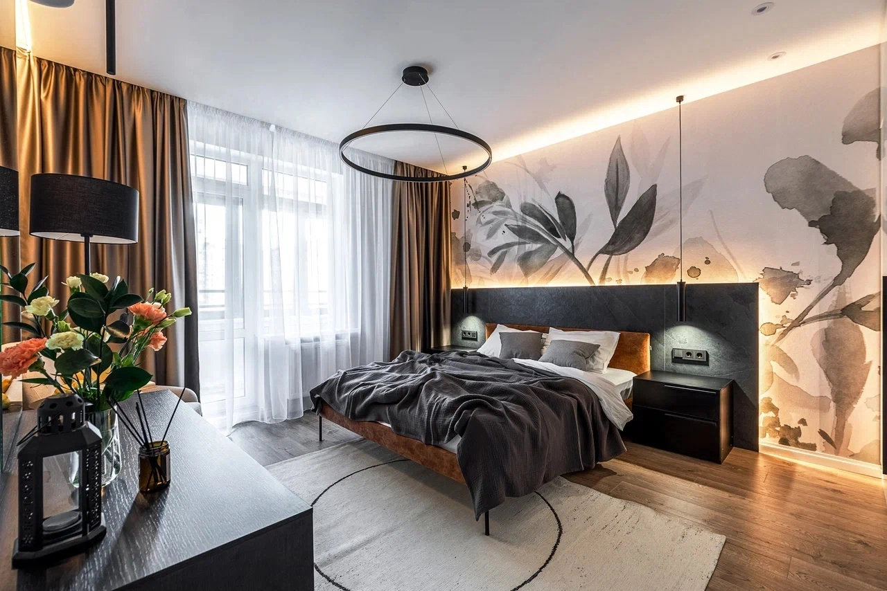 Спальня выполнена по индивидуальному проекту. Кровать на устойчивых ножках с подъемным механизмом. Прикроватные тумбы выполнены из крашеного МДФ в тон интерьеру. Навесная тумба вместительная и удобная за счет открывающего механизма Рush-open бренда Blum.